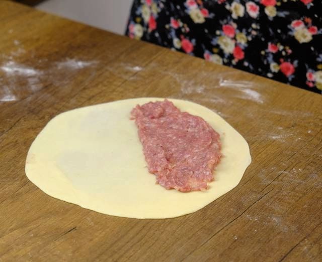 - Leg de vleesvulling in een dunne laag op de helft van elke opgerolde cirkel.