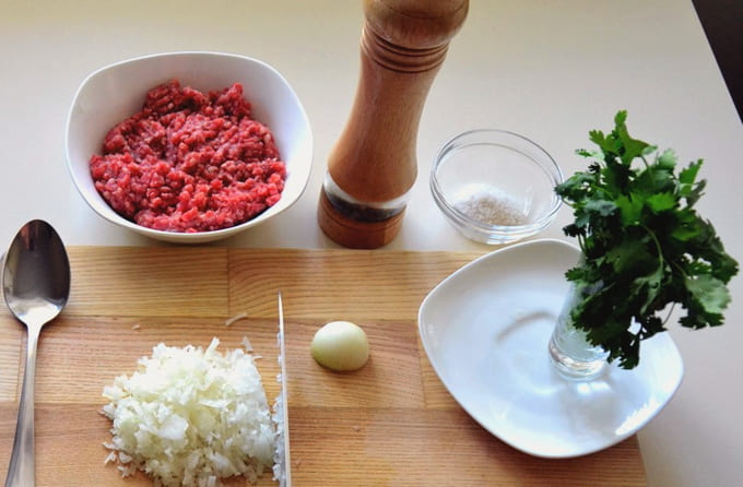 - We zullen de nodige producten klaarmaken. Het gehakt moet van tevoren worden ontdooid, de greens moeten worden gespoeld en de uien moeten worden geschild en gehakt.