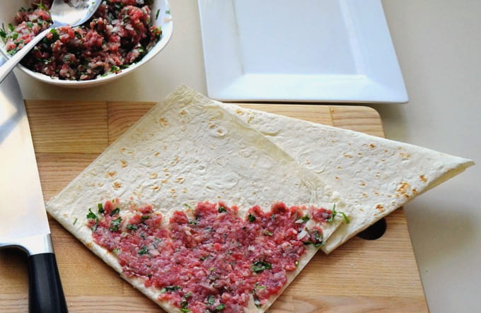 - Leg het gehakt met kruiden in een dunne laag op de helft van elk vierkant pitabroodje. Vouw dubbel.