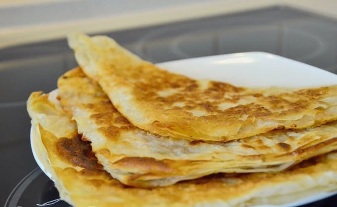 - Verhit een koekenpan met plantaardige olie. We verspreiden om de beurt dunne pitabroodjes. Bak aan beide kanten op matig vuur. De vulling moet goed gaar zijn.