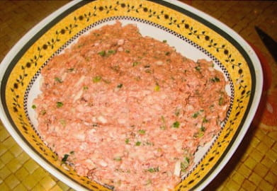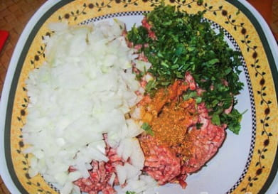 - Roer voor de vulling het gehakt om met zout en zwarte peper. Voeg hieraan fijngesnipperde uien toe.