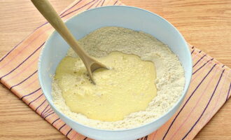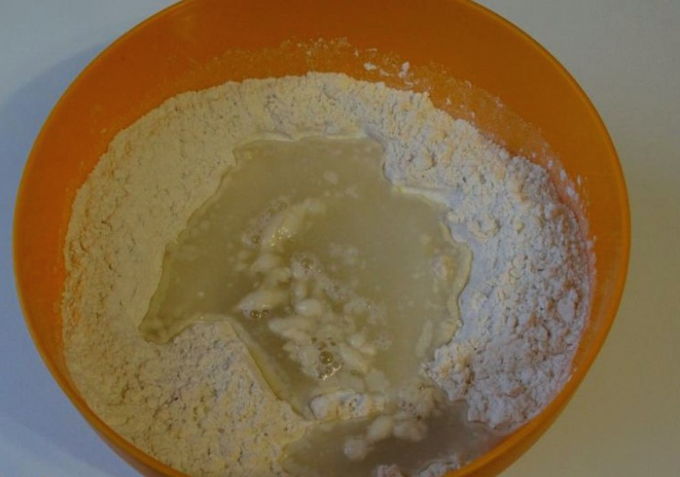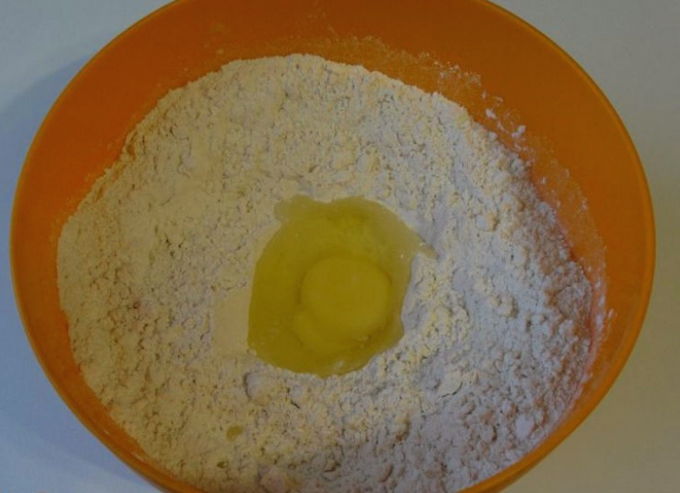 - Breek het ei tot een droog mengsel. Om het gemakkelijker te maken, kun je van tevoren een kleine trechter in de bloem maken.