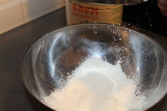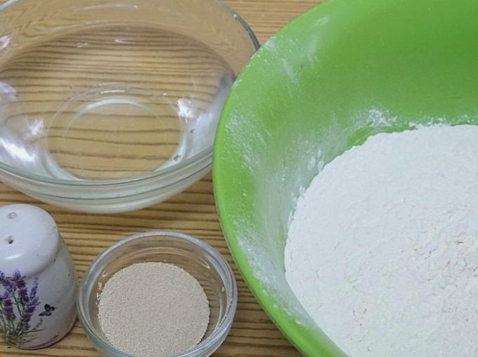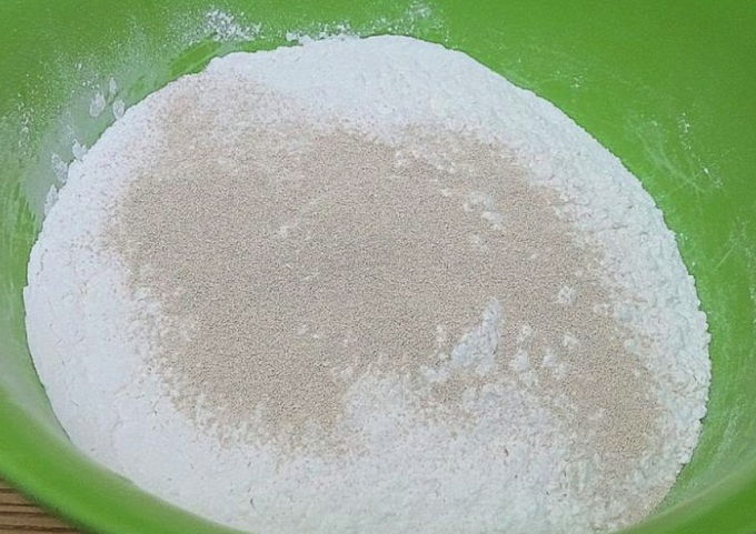 - Meng in een aparte kom de bloem en het zout. Het is raadzaam om het product 1-2 keer door een zeef te zeven. Voeg gist toe uit het droge mengsel, vul het met warm water en begin te roeren.