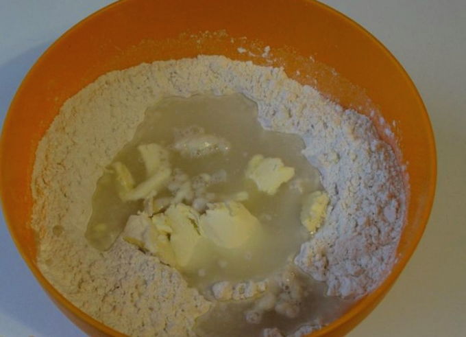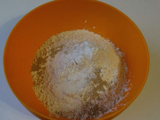 - Combineer bloem, gist, suiker en zout in een handig diep bord. Roer droog voedsel grondig.
