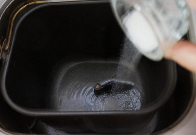 - Giet een glas water in de bak van de broodmachine. Voeg vervolgens het zout toe en roer het mengsel zodat het droge ingrediënt volledig is opgelost.