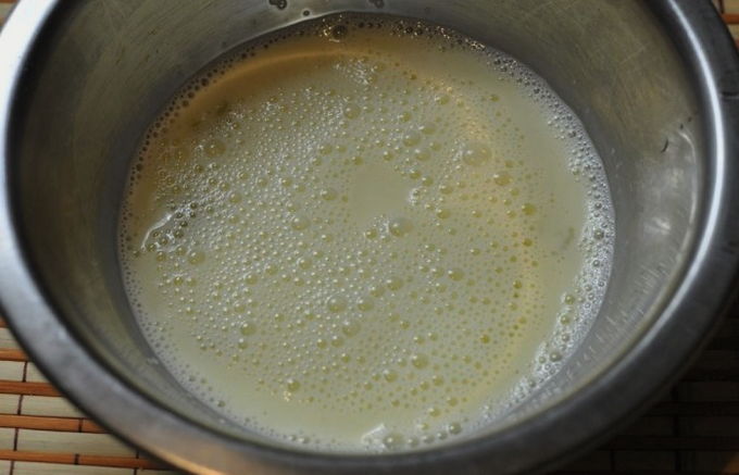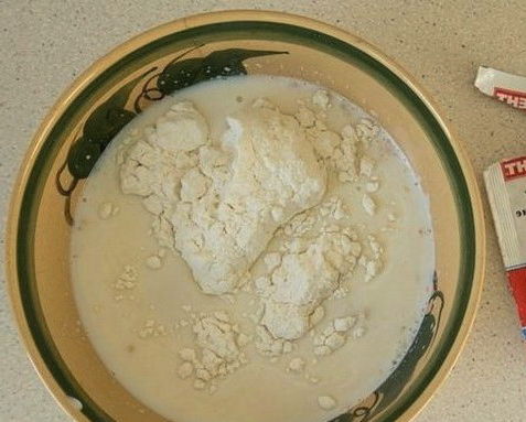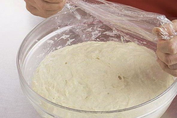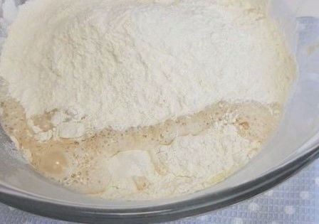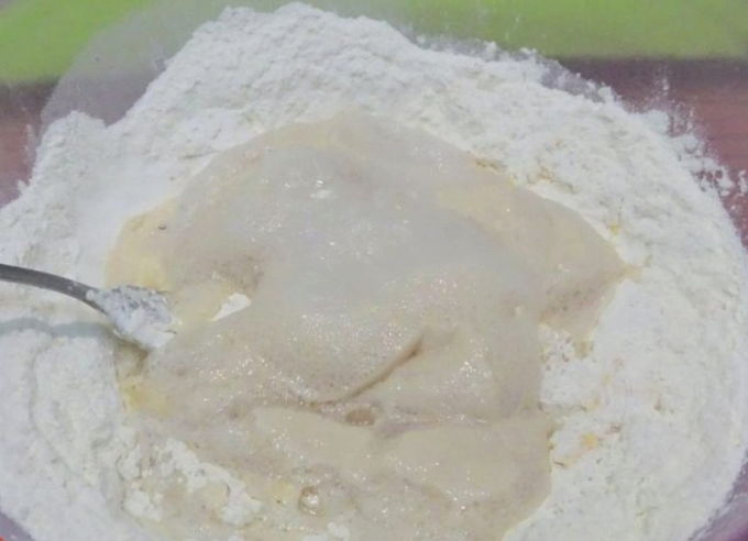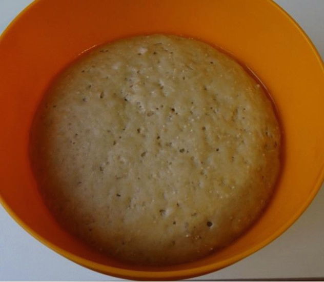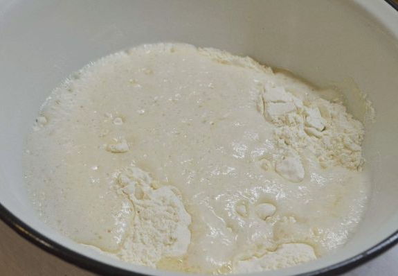 - Na een tijdje zal het gistdeeg het doen. We halen het eruit, weken het licht in bloem en gebruiken het bij verder koken.