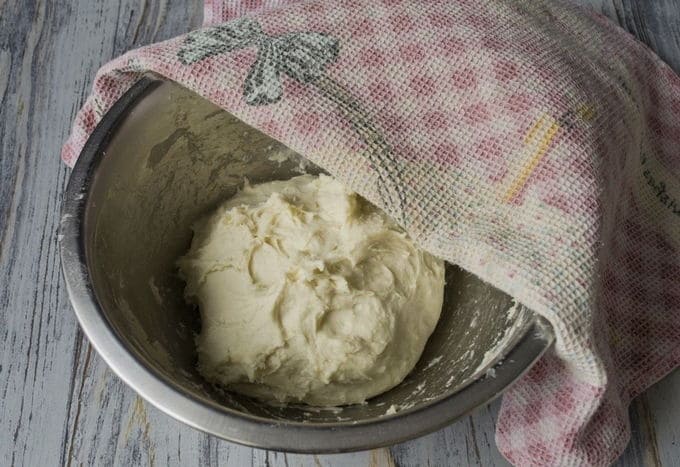 Giet olie in de massa en roer nogmaals goed tot een gladde bal deeg. We staan erop dat het ongeveer 10 minuten op een warme plaats staat.