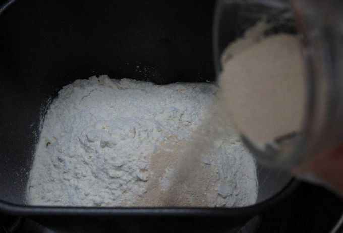 - Bloem zeven, suiker en droge gist toevoegen. Je hoeft nu niet te roeren. We zetten de "deeg"-modus aan en wachten 1,5 uur tot het product helemaal klaar is.