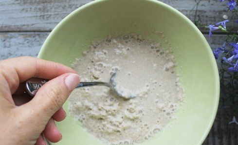 - Giet droge gist bij een glas warm water, maar het is belangrijk dat het niet heet is. Voeg hieraan een eetlepel bloem toe, roer en laat 15 minuten trekken.