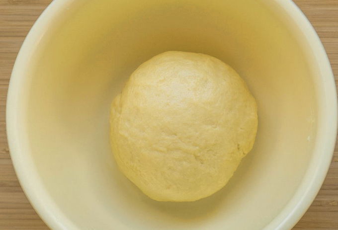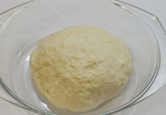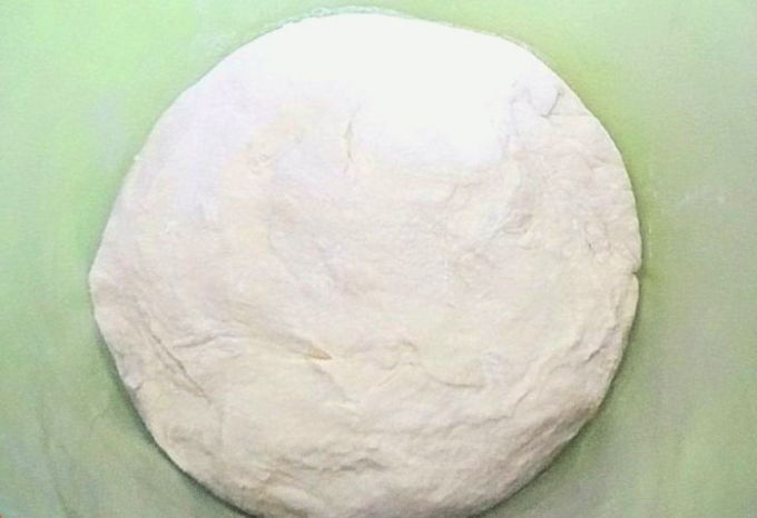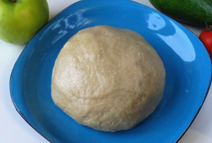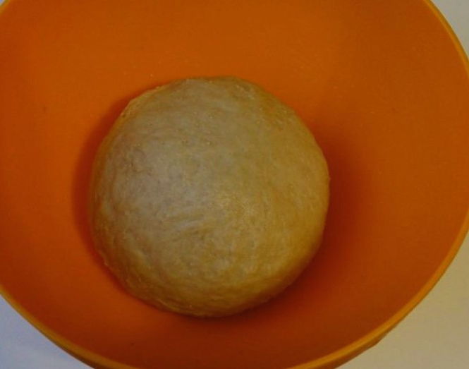 - Kneed het deeg door er plantaardige olie aan toe te voegen. We vormen een gladde bal, die we in een bord plaatsen en afdekken met een film of een handdoek. We laten het werkstuk 1 uur op een warme plaats staan.