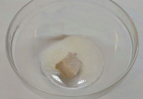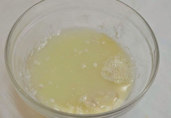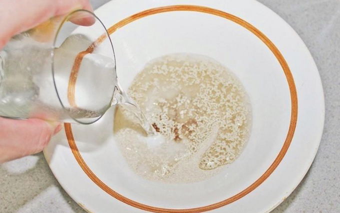 - Combineer droge gist met suiker, giet een half glas warm water. Roer grondig en laat 5-7 minuten staan.