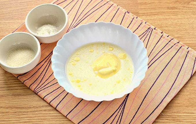 - Zeef bloem tot de vloeibare massa en voeg gesmolten boter toe. Roer het deeg grondig. We doen het resulterende homogene product in een zak en sturen het 1 uur naar de koelkast.