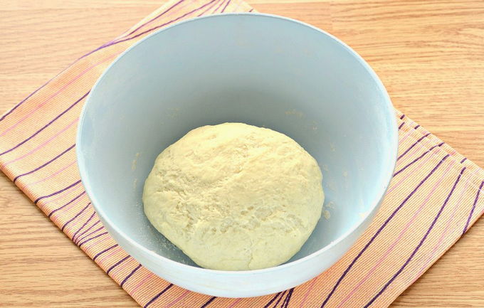- Kneed het deeg door er plantaardige olie aan toe te voegen. We vormen een gladde bal, die we in een bord plaatsen en afdekken met een film of een handdoek. We laten het werkstuk 1 uur op een warme plaats staan.