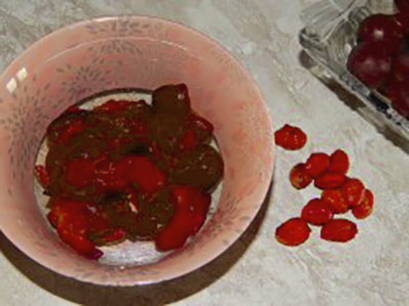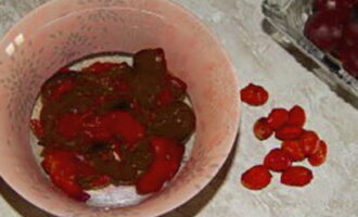 - Sorteer de kersenpruim, scheur de staarten eraf, was en gooi ze weg in een vergiet.