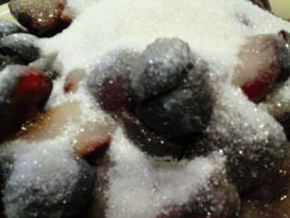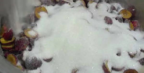 - Bedek de kersenpruim met suiker, laat het een paar uur staan zodat het sap eruit kan.