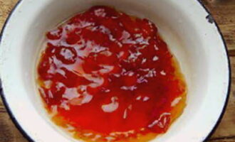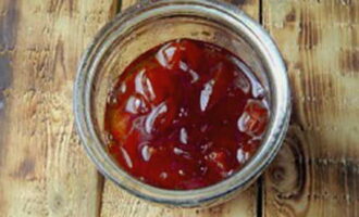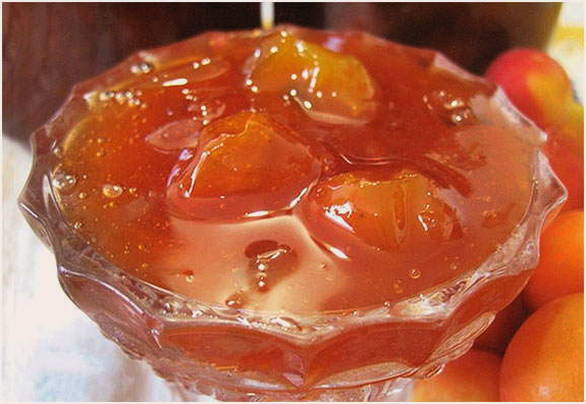 - Doe kersenpruim en sinaasappels in kokende suikersiroop, roer en kook 5 minuten. Haal vervolgens de pan van het vuur, laat afkoelen en herhaal deze procedure nog 2 keer.