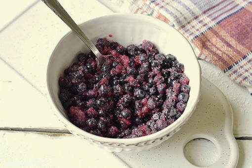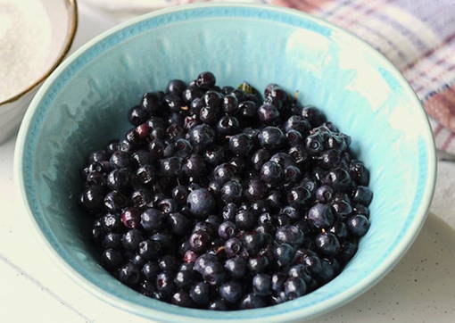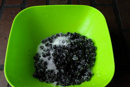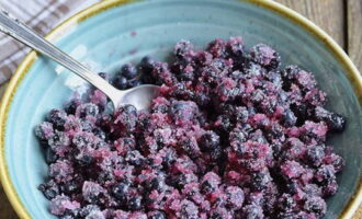 - Doe de bessen in een kom, voeg suiker toe en roer. Laat de bosbessen 30-60 minuten staan.