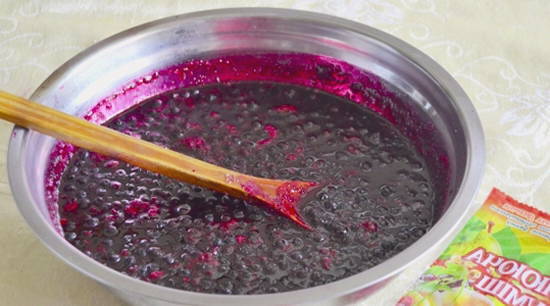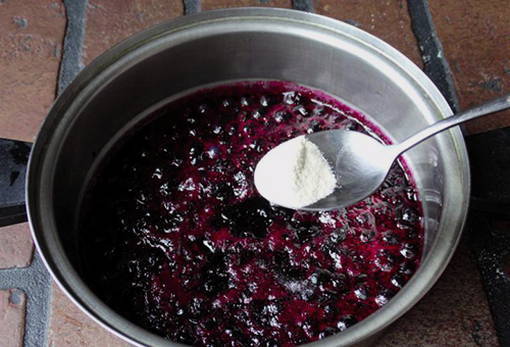 Om de bessenjam dikker te maken, wordt er tijdens het koken gelatine aan toegevoegd. Bosbessenjam blijkt homogeen te zijn met kleine insluitsels van zaden, wat het zijn eigen unieke charme geeft.
