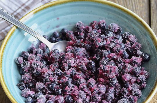 - Doe de bessen in een kom, voeg suiker toe en roer. Laat de bosbessen 30-60 minuten staan.
