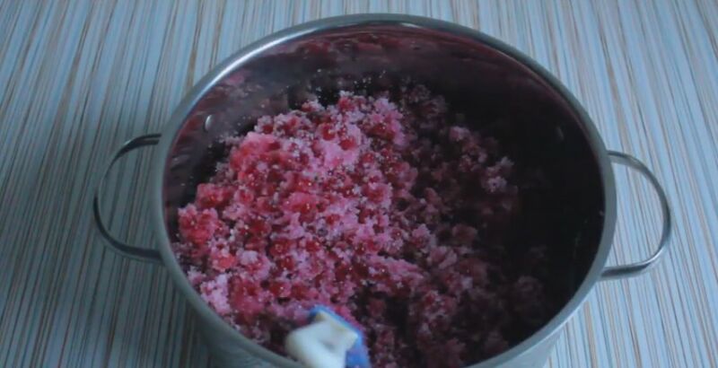- Giet de voorbereide krenten in een pan om jam te koken, voeg de benodigde hoeveelheid suiker toe en roer met de hand, in een poging de bessen te pletten.