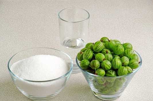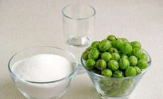 Meet de benodigde hoeveelheid suiker, water en bessen af. De kruisbessen moeten groen maar volwassen genoeg zijn.