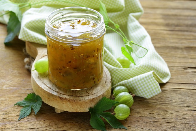 Kruisbessenjam, bereid voor de winter, is zowel een heerlijk onafhankelijk dessert als een goede optie om te vullen voor het bakken. Door het hoge gehalte aan pectine in de bessen is deze jam dik zonder extra verdikkingsmiddelen. Het wordt ofwel alleen bereid van kruisbessen met suiker, of met de toevoeging van andere bessen, evenals citrusvruchten. In sommige recepten worden de bessen door een vleesmolen gerold, in andere worden hele bessen gekookt.