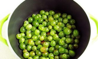 - Verwijder de staarten van de kruisbes die onder water is gewassen, verwijder de bestaande schade van de huid. Week de bessen 1 uur in warm water.