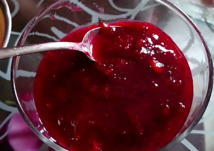 Een mengsel van kruisbessen en zwarte bessen geeft een spectaculaire bordeauxrode kleur. Jam wordt gemaakt van gepureerde bessen en ingekookt tot de gewenste dichtheid. Indien gewenst kan een deel van de bessen intact worden gelaten.