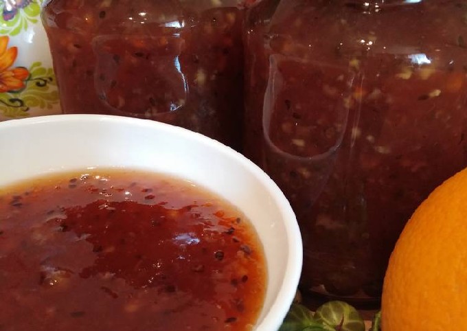 Kruisbessen zijn in goede harmonie met citrusvruchten en lenen hun karakteristieke zuurheid. Dit recept omvat het draaien van kruisbessen en sinaasappels door een vleesmolen tot in de schil. De jam is goudhonig van kleur met een aangenaam citrusaroma.