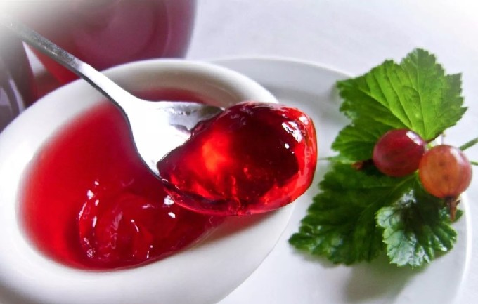 Door gelatine toe te voegen aan het kruisbessendessert wordt het dik, als een dichte gelei. Verhoog de aanbevolen dosering van het geleermiddel niet, anders neemt de smaak van de jam af.