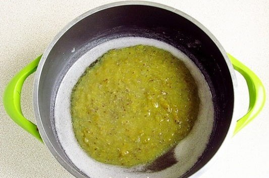 - Meng de resulterende halfvloeibare jambasis met suiker en zet in brand. Verwijder het schuim van de gekookte jam, zet het vermogen onder de pan lager en kook de zoete massa 5 minuten.