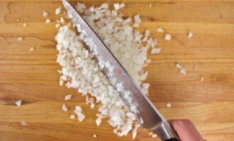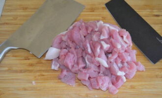 Hak het vlees zoals gehakt, maar het is beter om het met een mes te hakken, zo krijg je een aangenamere consistentie voor de vulling.