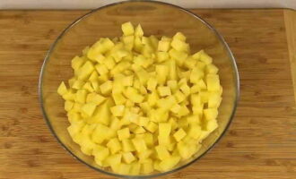 Snijd de aardappelen in kleine blokjes of blokjes. Hier kunt u uitgaan van uw eigen voorkeuren, maar het is de moeite waard om te onthouden dat kleine stukjes sneller gaar zijn.