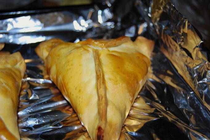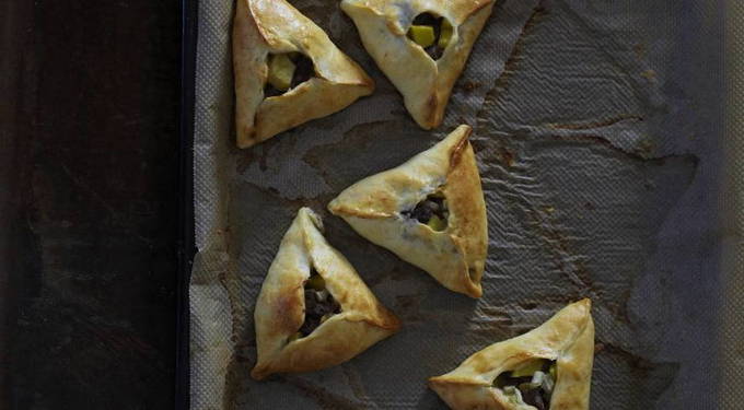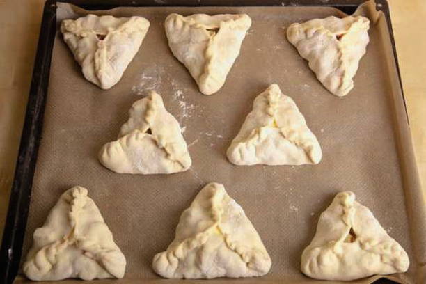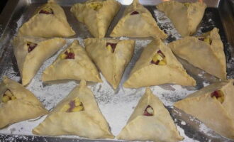 - Verdeel het deeg in stukken, rol ze uit en leg de vulling erop. Vorm driehoekige pasteitjes met een gat aan de bovenkant.