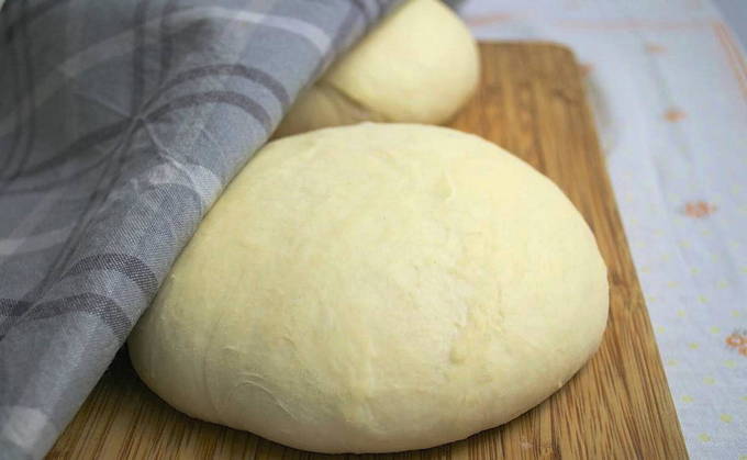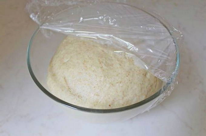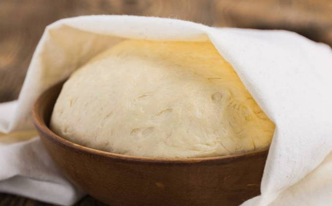 - Verwarm de melk, smelt de boter, meng de vloeibare ingrediënten met gist, ei, zout, suiker en voeg bloem toe tot een vrij dicht, elastisch deeg. Wikkel het in plasticfolie en laat het 20 minuten bij kamertemperatuur rijpen.