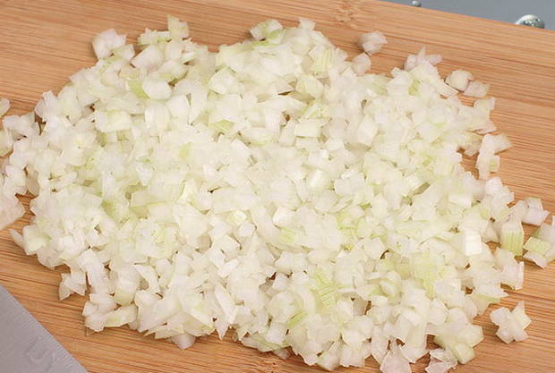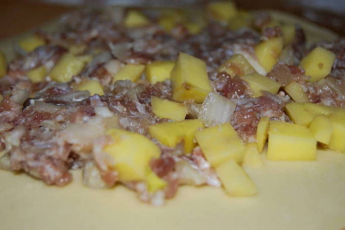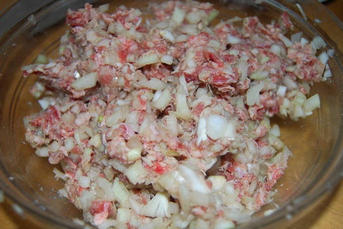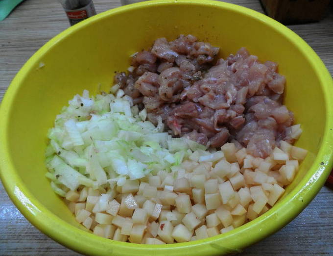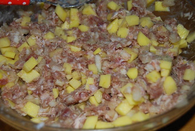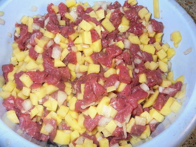 - Snijd het rundvlees met een kleine hoeveelheid vet, hak de uienkoppen fijn, snijd de aardappelen in blokjes van 5-7 mm. Kruid de vulling met peper en zout en meng alle ingrediënten.
