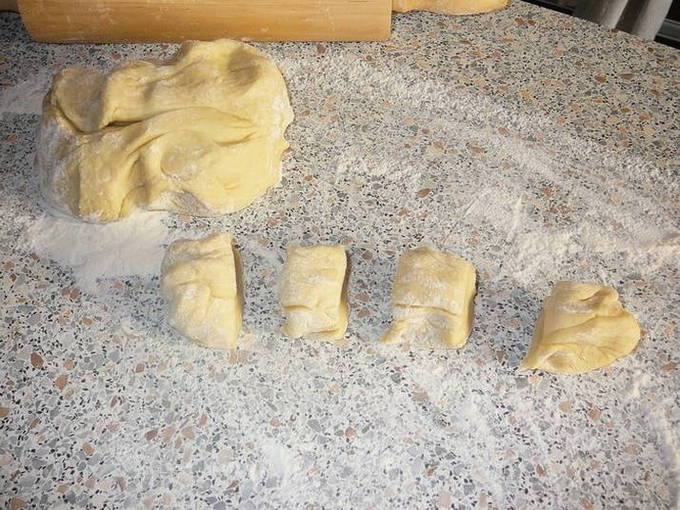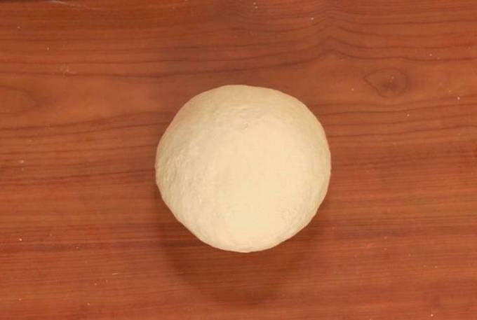 - Voeg een beetje bloem toe, kneed grondig zodat er geen klontjes zijn. Wanneer het deeg plastic wordt, wikkel het dan in plasticfolie en bewaar het in de koelkast.