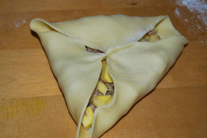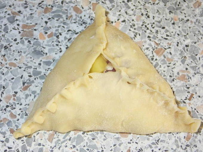 - Verdeel het deeg in stukken, die elk in dunne cakes moeten worden uitgerold. De vulling is in het midden van elk gelegd en de randen zijn gevormd om een driehoek te maken met een open gat erop.