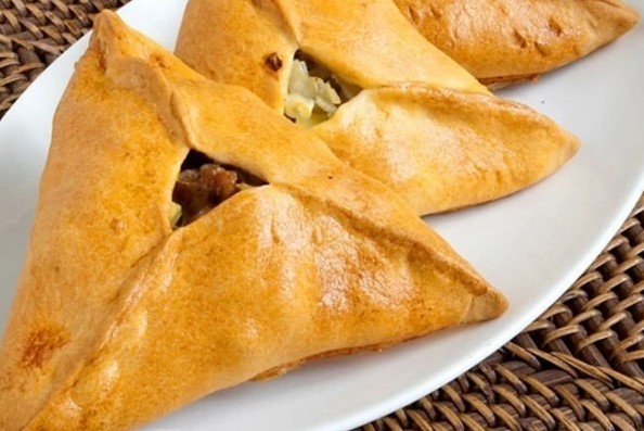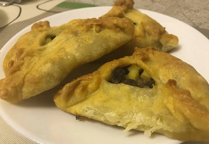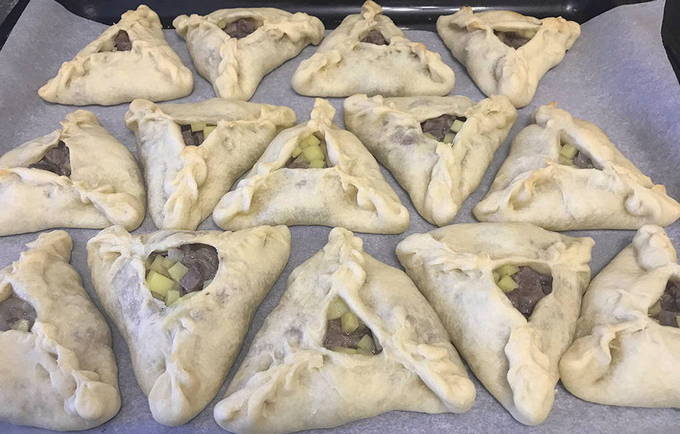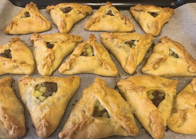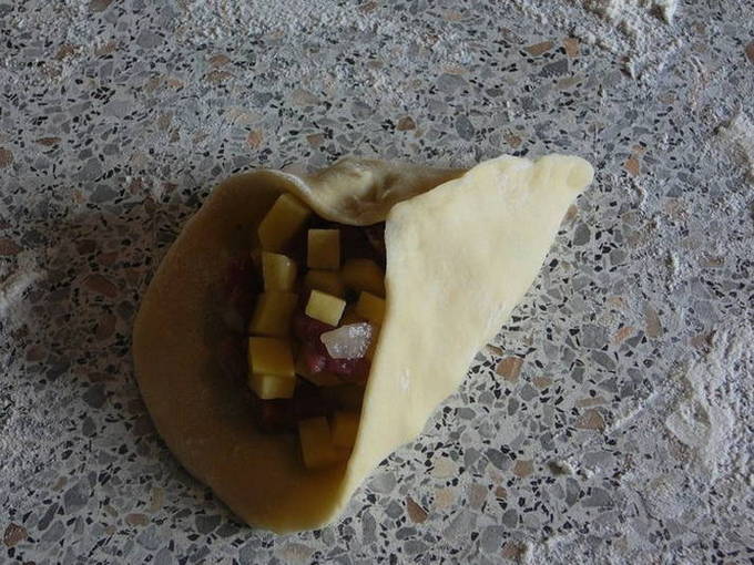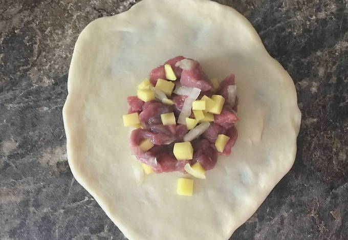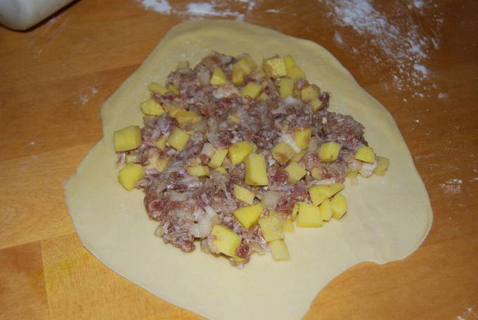 Rol het deeg uit, snij in porties en leg de vulling erop: gehakt met uien, aardappelen en een stukje boter, vorm driehoekjes ter grootte van een handpalm.