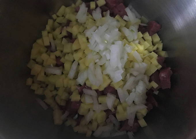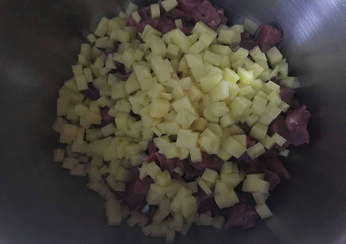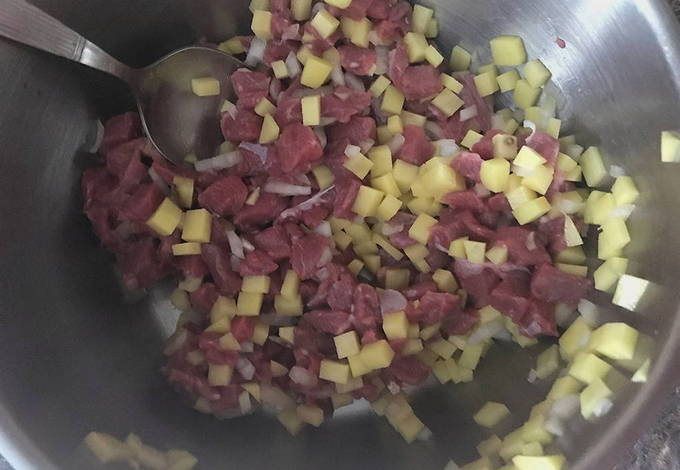 - Snijd het rundvlees en de aardappelen fijn, bij voorkeur in gelijke blokjes, snipper de ui. Kook de aardappelen na het snijden 5 minuten. Meng de ingrediënten voor de vulling, breng op smaak met peper en zout.