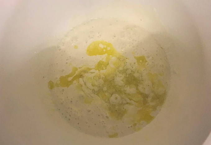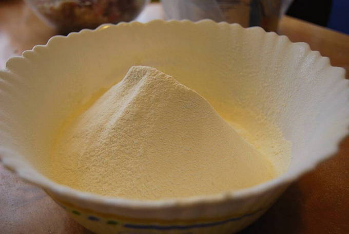 - Voeg daar eidooier toe, 1,5 theel. bakpoeder en de aangegeven hoeveelheid boter, die eerst moet worden gesmolten. Breng het mengsel op smaak met zout en roer voorzichtig de bloem erdoor.