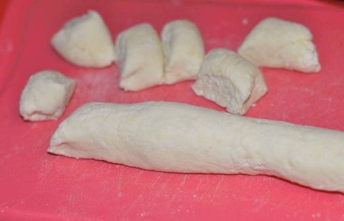 - Rol het deeg uit van een middeldikke worst, verdeel het in delen.