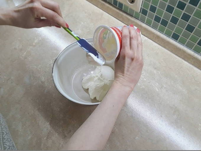 - Kefir en zure room voor het deeg moeten op kamertemperatuur zijn. Ze worden gemengd in een diepe kom.