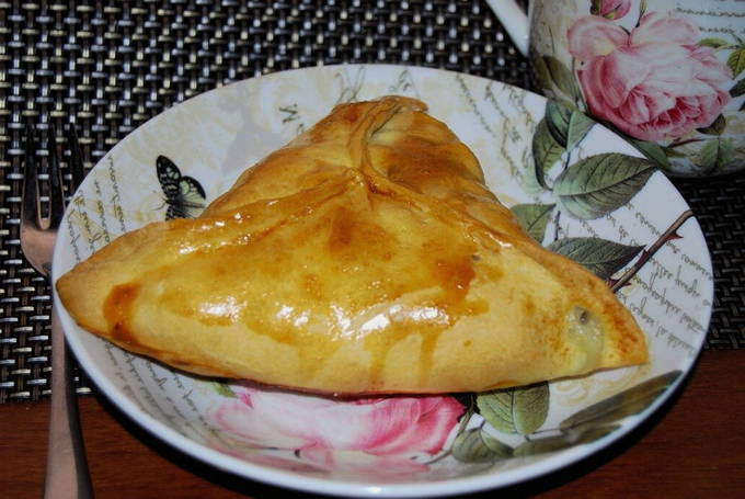 - Verdeel het gistdeeg in stukjes en rol ze stuk voor stuk op, doe een deel van de vulling op een hoopje in het midden, vorm driehoekige pasteitjes met een gat erop.