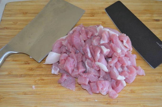 Hak het vlees zoals gehakt, maar het is beter om het met een mes te hakken, zo krijg je een aangenamere consistentie voor de vulling.