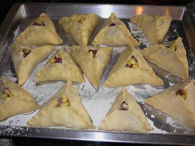 - Verdeel het deeg in stukken, rol ze uit en leg de vulling erop. Vorm driehoekige pasteitjes met een gat aan de bovenkant.