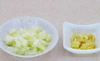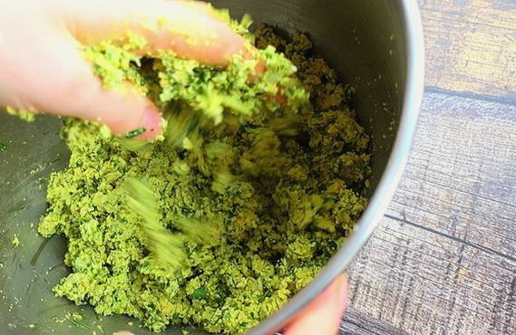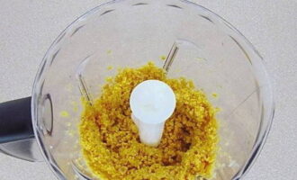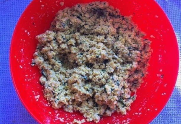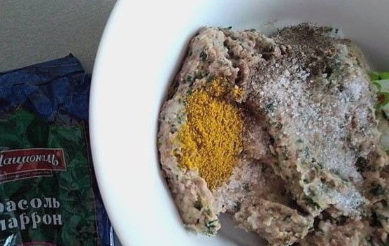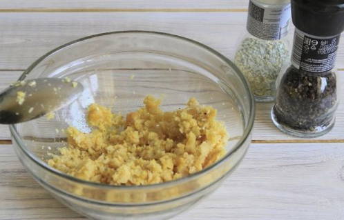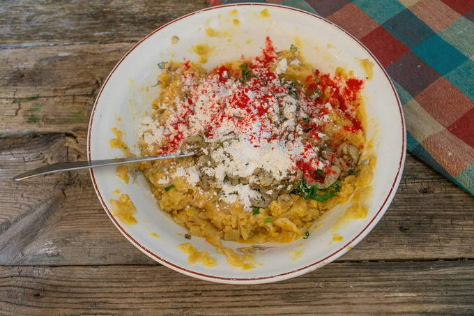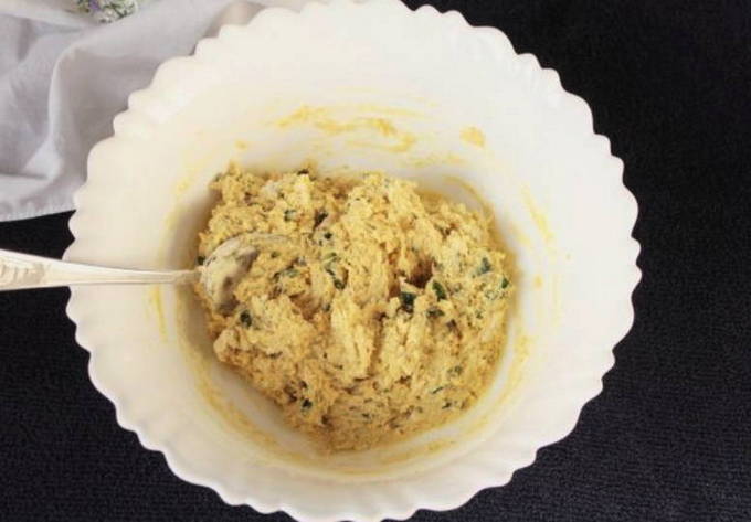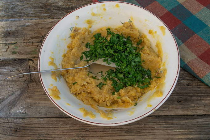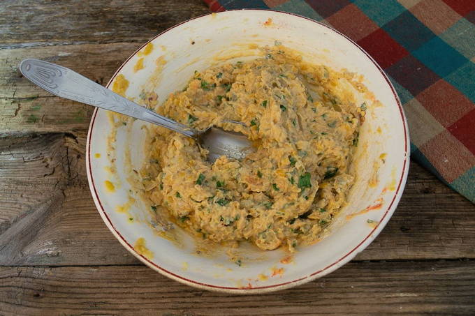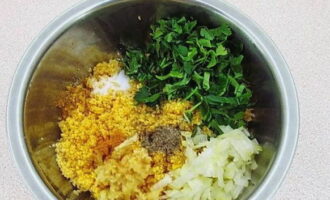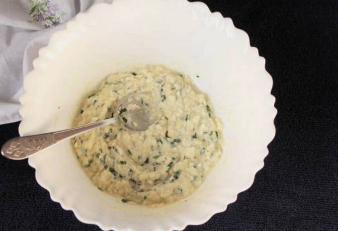- Voeg gesnipperde ui, knoflook en kruiden toe aan de resulterende pap. We vullen de bereiding aan met zout, kurkuma, plantaardige olie en kneden alles tot een homogeen deeg.