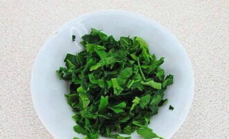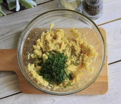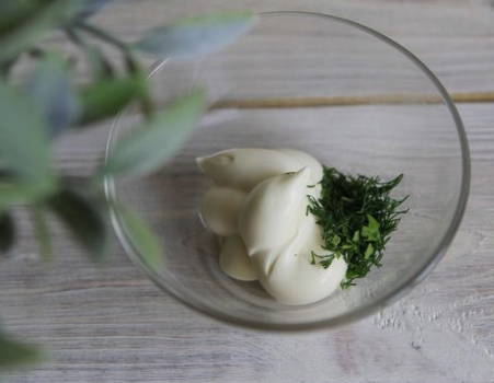 - Vervolgens vullen we het werkstuk aan met gehakte knoflook en dille. Kneed opnieuw tot een gladde massa.