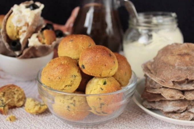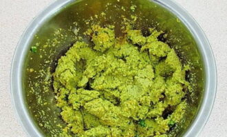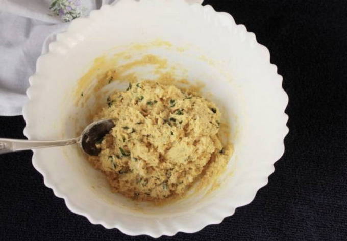 - We malen het eindproduct op elke beschikbare manier. We vullen het aan met bloem, boter, kruiden en gesneden groenten met kruiden. Kneed de producten tot een gladde massa.