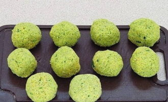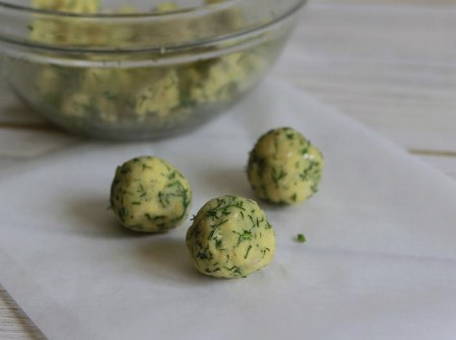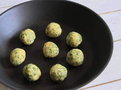 - Van het resulterende deeg maken we kleine balletjes van gelijke grootte. We bakken ze tot ze blozen in een grote hoeveelheid kokende olie.